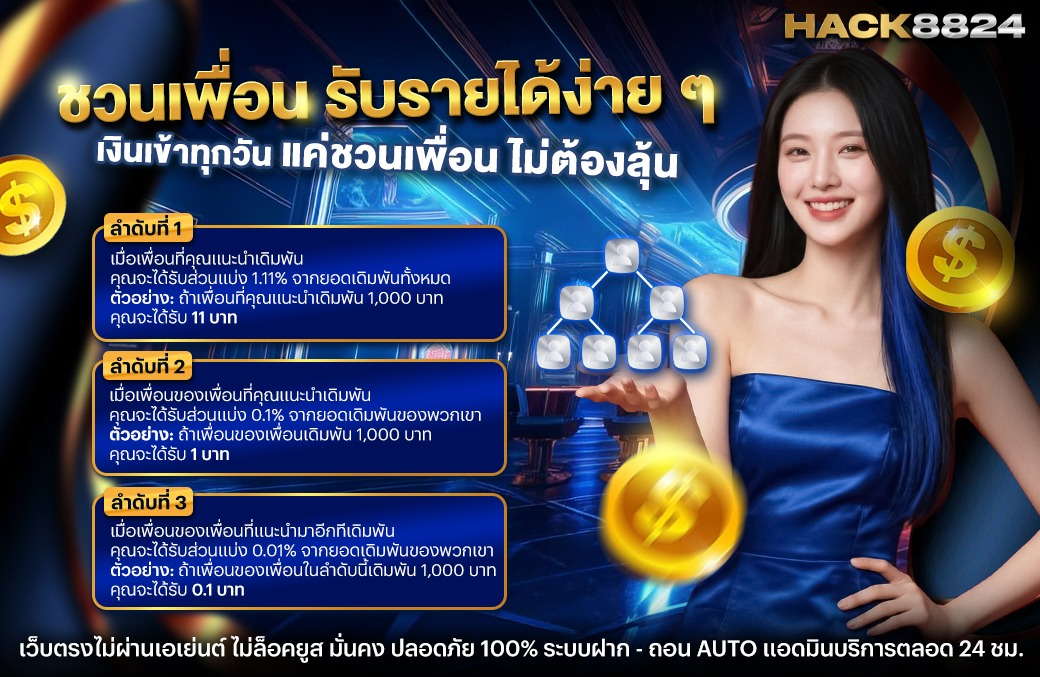 ที่พิเศษไปกว่านั้น HACK8824 มีระบบชวนเพื่อนที่ให้ค่าคอมมิชชั่นสูงถึง 0.5% จากยอดเล่นของเพื่อน ยิ่งชวนมาก ยิ่งได้มาก ไม่มีเพดานจำกัด และเพื่อนที่คุณชวนมาก็จะได้รับโบนัสพิเศษ 50% แรกเข้าเช่นกัน